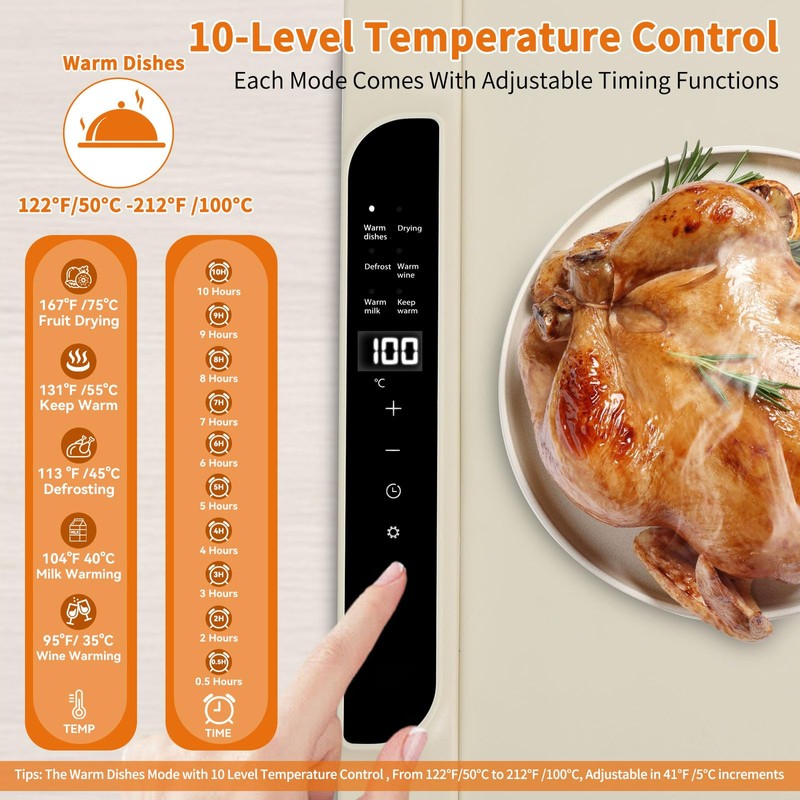 - 10-Level Custom Temperature Control & 5 Preset Modes: Enjoy precision warming with 5 one-touch presets: Fruit Drying (167°F/75°C), Defrost (113°F/45°C),Wine Warm (95°F/35°C),Milk Warm (104°F/40°C),Keep Warm (131°F/55°C). For custom needs, our 10-level adjustable Warm Dishes mode (122°F-212°F/50°C-100°C) allows 5°C/41°F precision adjustments. Perfectly maintain any dish's ideal temperature with effortless control