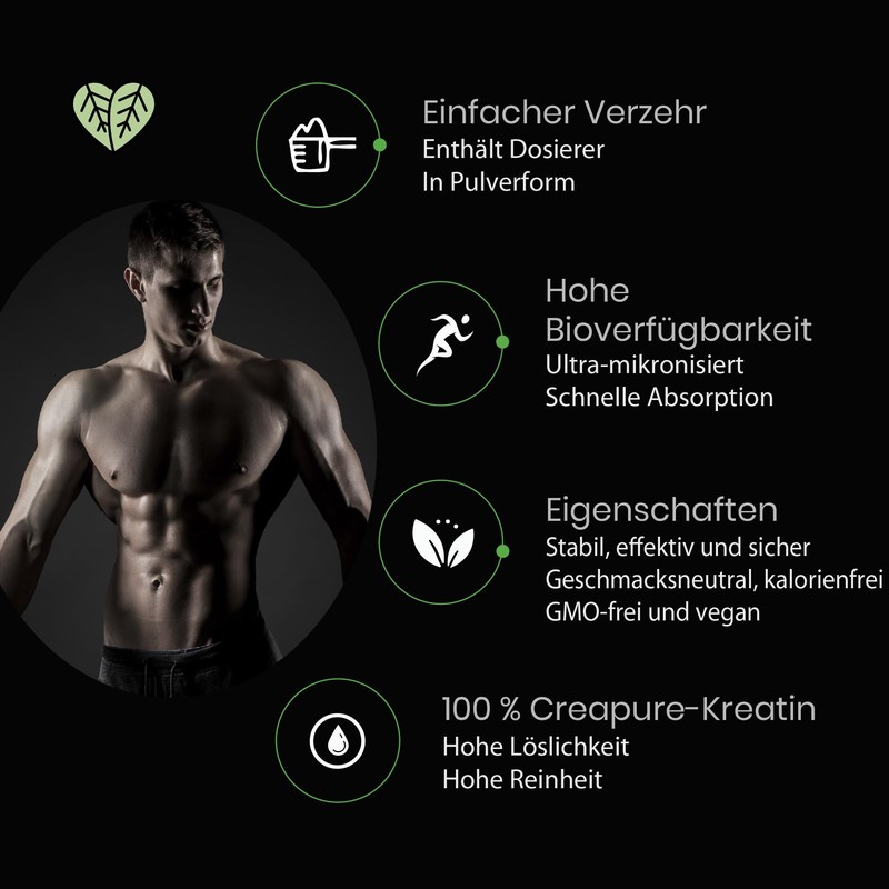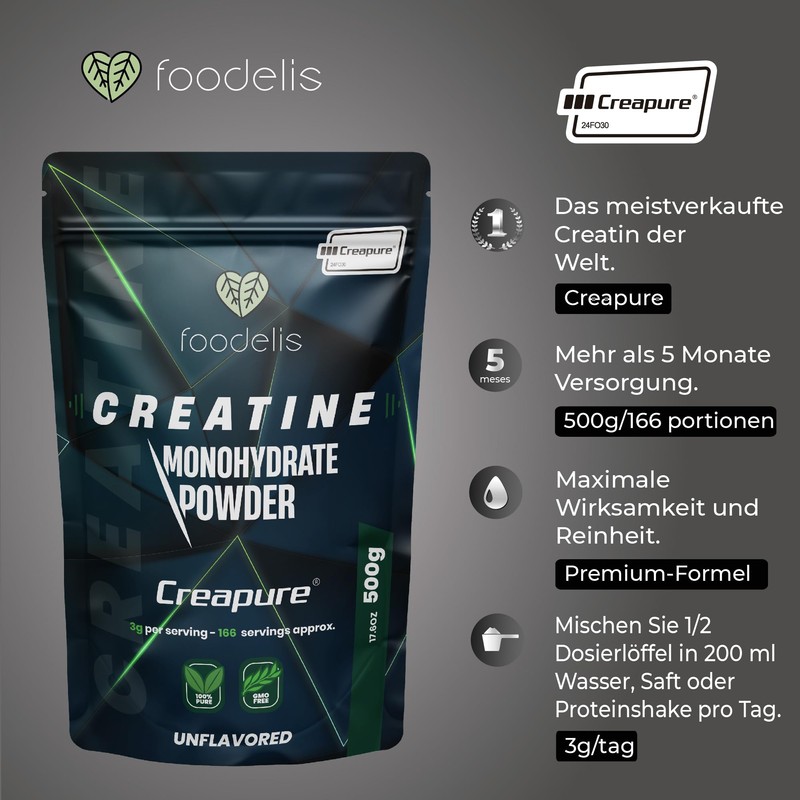 - Nur Kreatin in Pulverform, nur das, was du brauchst: Erreiche deine Ziele und forme den K?rper, den du dir wnschst, mit 100% Creapure Kreatin-Monohydrat von Foodelis. Ultramikronisiert, von h?chster Reinheit und ohne fragwrdige Zusatzstoffe.