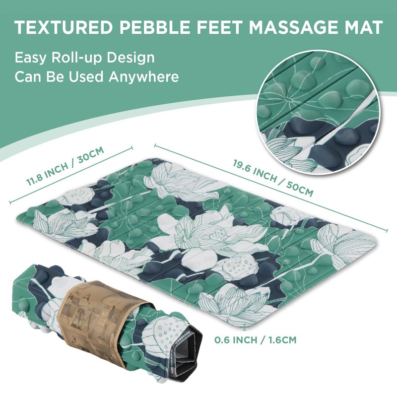 - Invigorating Textured Massage & Portable Design - Experience a spa-like foot massage at your convenience! The textured pebble surface mimics the feeling of walking on smooth stones, providing a stimulating and therapeutic experience. Plus, the convenient roll-up design allows you to easily store the mat or take it with you anywhere. Measuring L11.8 x W19.6 inches and 0.6 inches thick, this portable Foot Massage Pad is the perfect size for use at home, the office, or during travel.