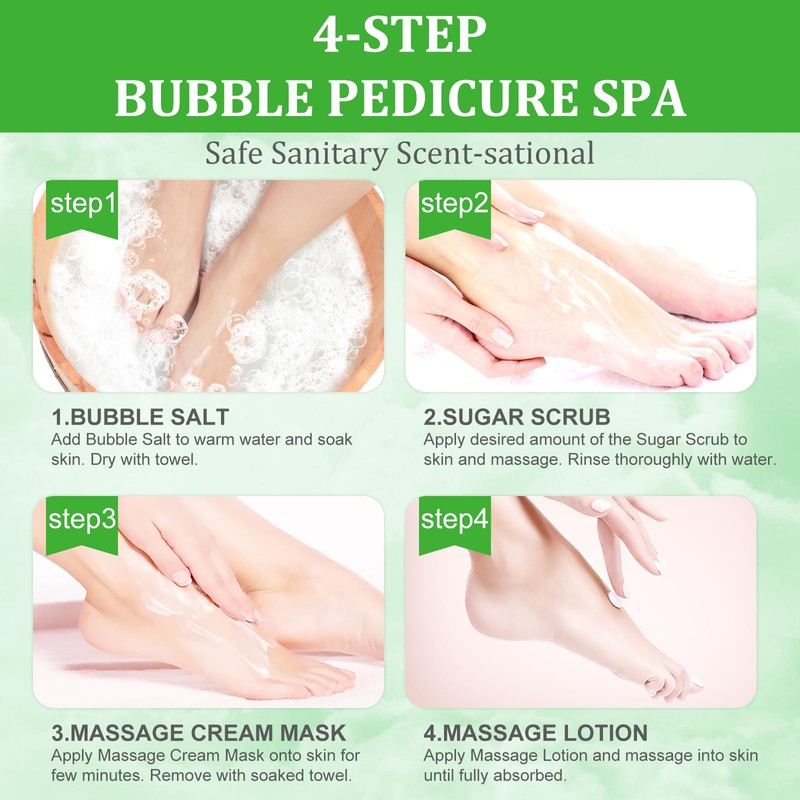 - 🍋[Package Includes]: Exfoliating Foot Spa Pedicure Kit consists of Bubble Salt, Sugar Scrub, Massage Mask, and Massage Lotion for a 4-step foot spa at home. Formated to be gentle on the skin, you are sure to feel your skin feeling soft and supple after use.