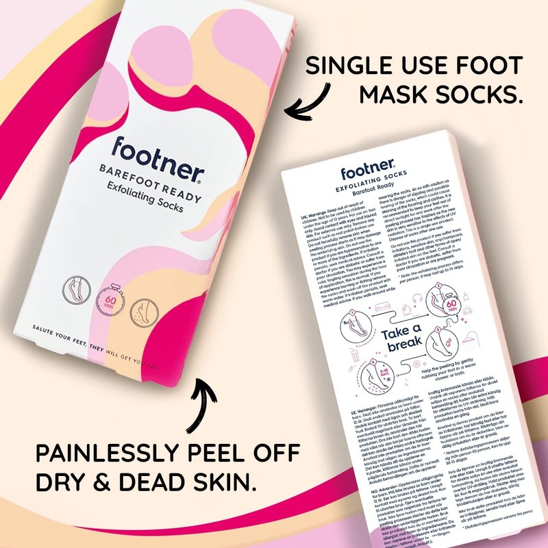 Footner Exfoliating Socks are the easy way to remove hard, dry skin on your feet. The intensive mask peels away hard old cracked skin on your feet. It’s a fast, effective home treatment – leaving you with that baby soft, post pedicure feeling on your feet just days after the single 60 minute application.