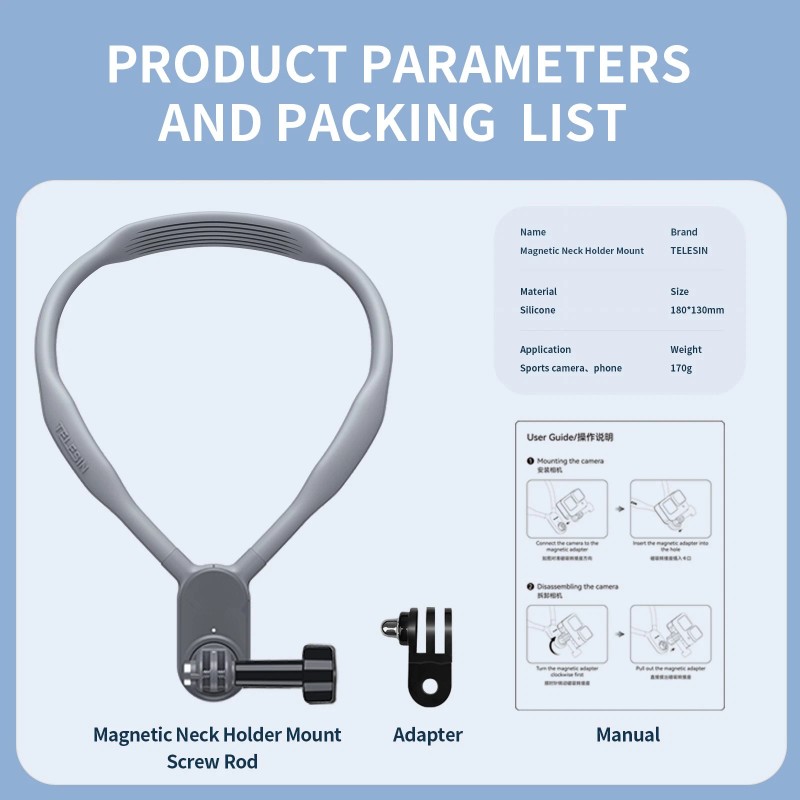 2.Free your hands. Quick release button helps you remove the neck hold mount. Magnetic rotating interface quick to wear and easy to install.