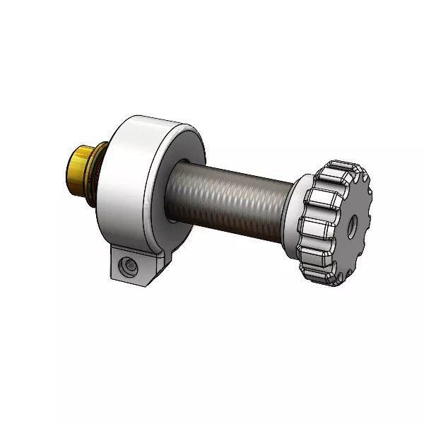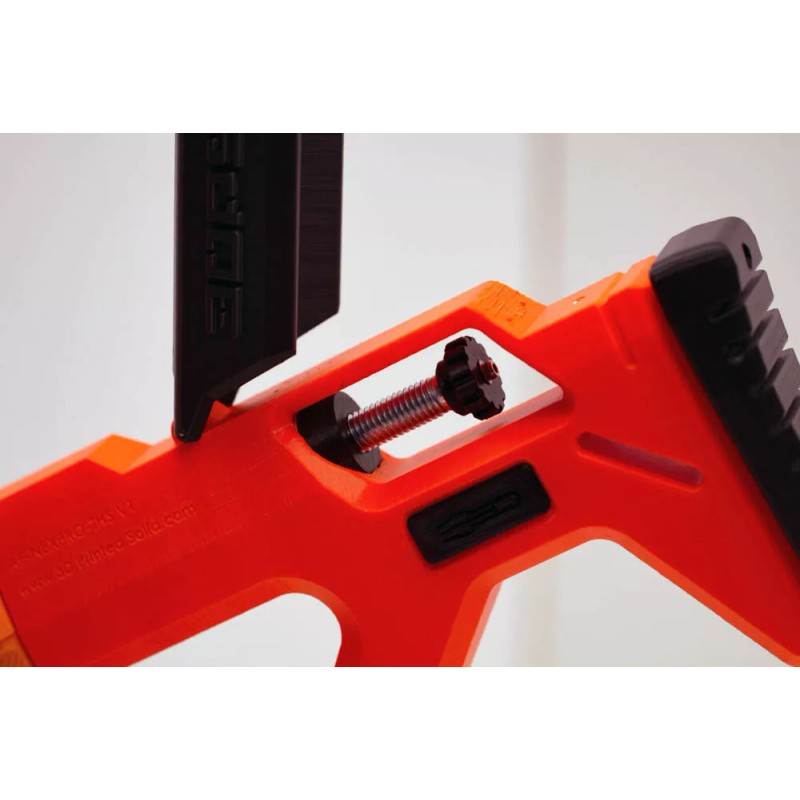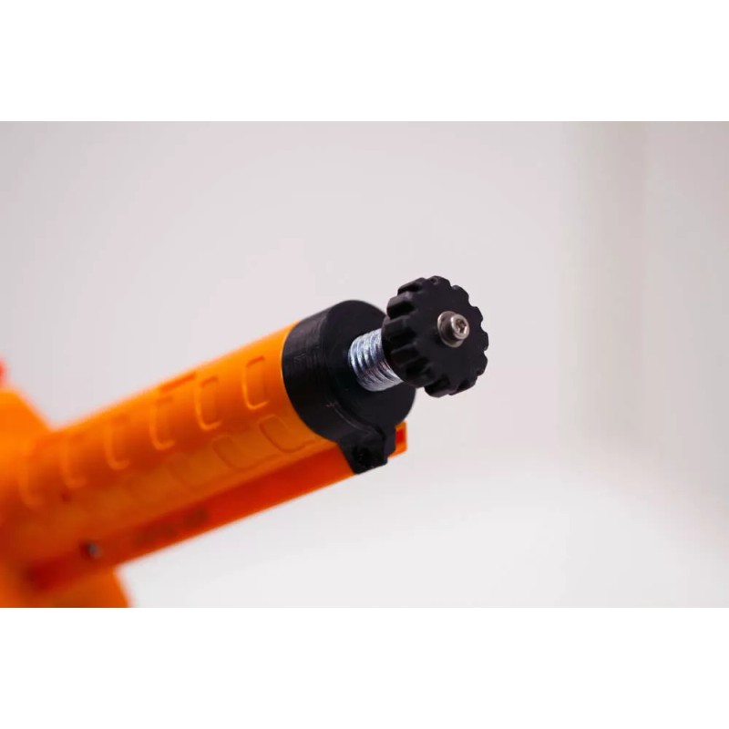 Maximize the Nexus Pro dart speed with the Spring Adjuster! The Nexus Pro is spring powered, using the grip to compress the spring and the trigger releases the force. We took things just a little bit farther; a product that compresses the spring at a custom user-controlled distance, increasing the force at which the darts are propelled by roughly fifty percent. The Spring Adjuster is made up of a steel screw, a 3DPS-made brass spring bushing with a 3D printed knob and end cap. Designed easy to use, just turn the adjusting screw (clockwise to increase force distance, counter clockwise to return to stock distance.)