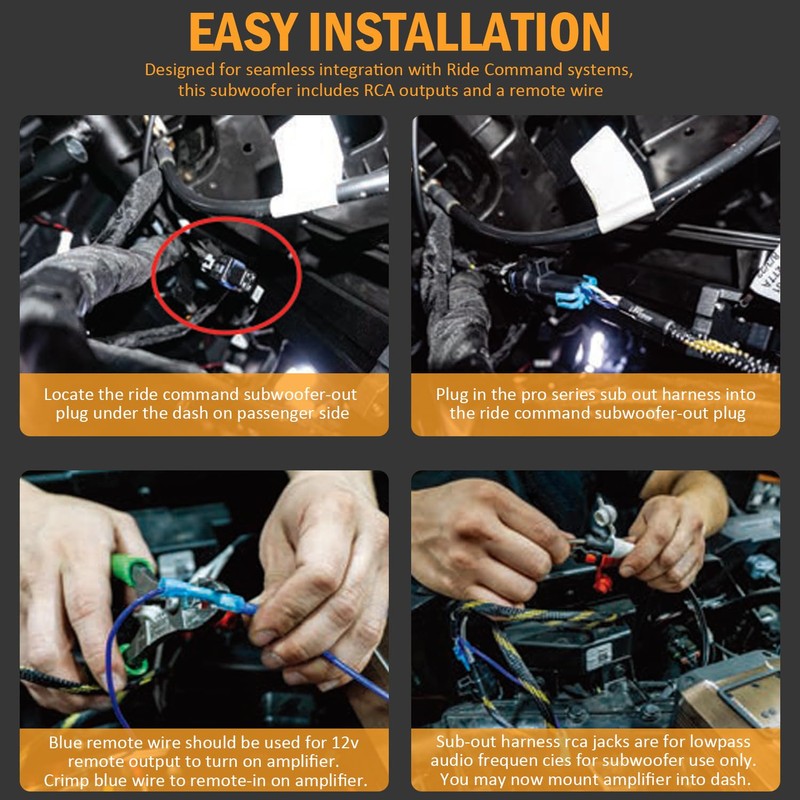 - PLUG AND PLAY Sub output harness: Designed for seamless integration with Ride Command systems, this subwoofer includes RCA outputs and a remote wire, simplifying setup and minimizing hassle.