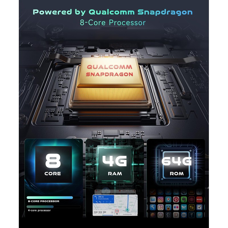 • Powered by Qualcomm Snapdragon 8-Core Processor: Equipped with Qualcomm Snapdragon processor, 4GB RAM, 64GB ROM, and an 8-core Android 13 system, this Android car stereo delivers high performance and low power consumption. Its fast, stable operation ensures smooth multitasking and quick app launches. Whether you're streaming music or using GPS, it runs effortlessly