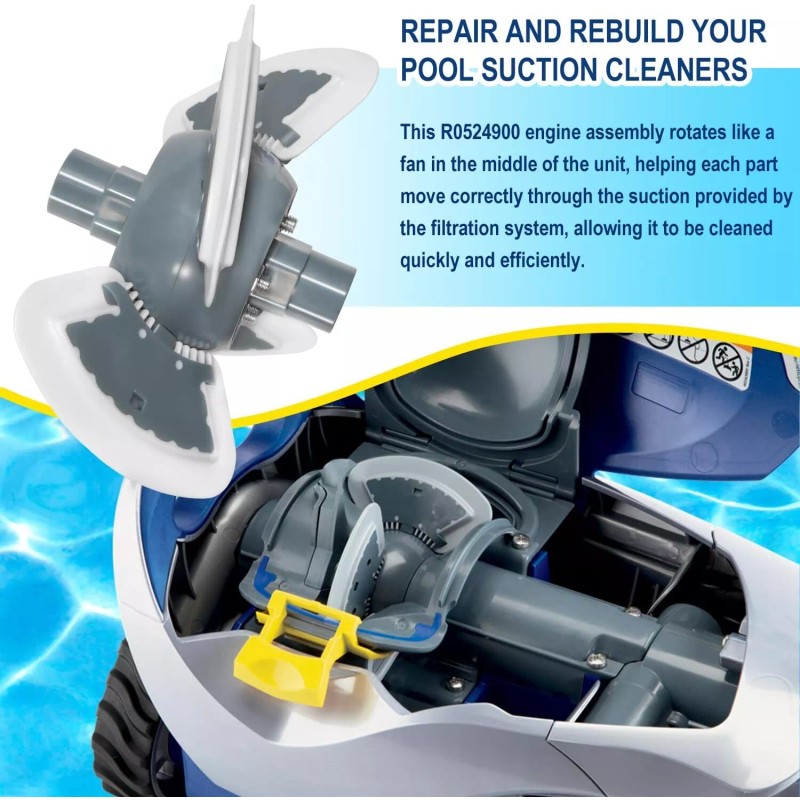 • 1)This R0524900 engine assembly rotates like a fan in the middle of the unit, helping each part move correctly through the suction provided by the filtration system, allowing it to be cleaned quickly and efficiently. Repair and rebuild your pool suction cleaners, preventative maintenance of pool equipment to prepare for pool season