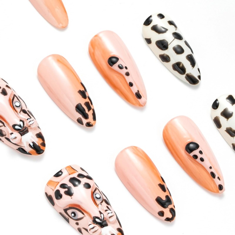 FORBELOVED NAILS|Nude Hand-pained Leopard Handmade Press On Nails|Medium Almond Stick On Nails|Charming 3D Texture Tails False Nails For Women And Girls|10Pcs/Set With Glue|(Nude-L)|FOB