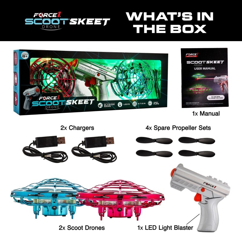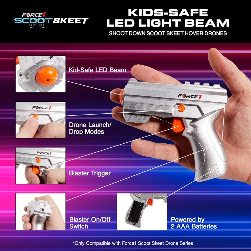 Featuring the same Original Scoot obstacle avoidance, 360° motion sensors, hand operation, and automatic hover functionality, the Scoot Skeet Duo offers an interactive addition with a new way to play by integrating new LED target shooting technology! | Team up with your friends and shoot the auto hover drones down using the included space blaster gun! The Scoot Skeet Drone series is a highly interactive and user-friendly drone shooting set, ideal for both entertainment and skill development. | Launch or drop quickly by changing the action modes on this compact-size blaster gun that has shooting accuracy of up to 8 ft! Comes with an easy switch on/off button to control the UFO drone like a pro. Scoot Skeet Blaster is only compatible with the Scoot Skeet Drones. |
