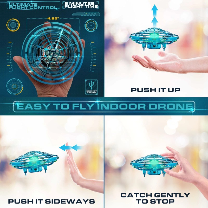 Place your hands on both sides of this flying ball drone, when the lights start blinking rapidly, swipe a hand under it to see the Scoot drone perform 360° flips! Make a gesture around the hand controlled drone and see it react to the obstacle and change direction. | Simply toss this hands free drone in the air and it will hover mid-air automatically with built in altitude hold. Constructed using premium quality material, this drone features a sturdy outer shell webbing with top and bottom sensors for a fun and safe activity for kids! | Contents