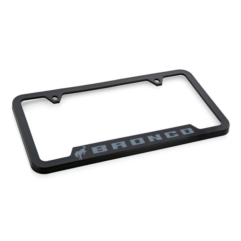 This Ford Bronco Plastic License Plate Frame Tag Holder is a Genuine Official Licensed Product. Features the Official Ford Bronco Horse Logo. The license frame measures 12 inches long and 6 inches tall and is designed to fit all standard issue DMV license plates. It can be used on either the Front or the Rear of the vehicle.