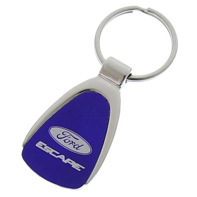 HighlightsThis Ford Escape key chain is a swirl effect teardrop key fob. Shiny chrome teardrop keychain with an anodized aluminum insert featuring small grooves on the colored face. Precision laser etched logo Includes a black gift box.