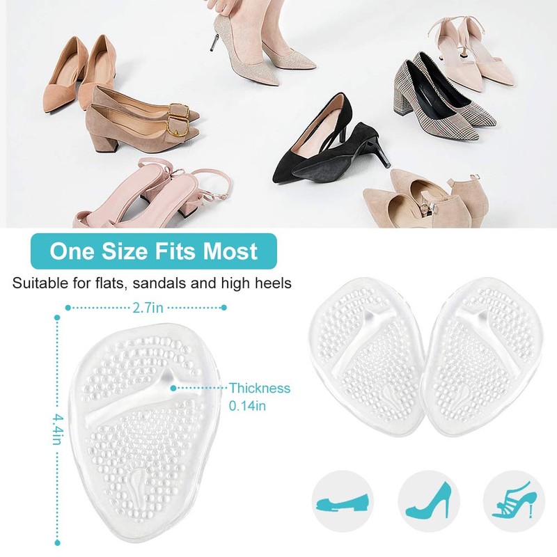 - [Shock Absorbing Gel Forefoot Insoles]:The soft gel forefoot pads are great for absorbing shock and vibration, they also distribute forefoot pressure and provide soft cushioning to reduce discomfort. Plus, the balls of feet are thick enough to provide comfort and fit the shape of your shoes and almost invisible in your shoes