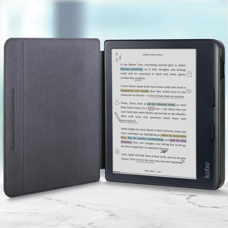 - Magnetic front cover - Magnets in the front cover of the Kobo Libra Colour/Colour case keep it in place when held in the hand and the case closed when not in use, which protects the screen of the