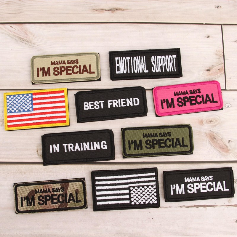 - 7 Alternative Patterns---We have several patterns of velcro to choose from."MAMA SAYS I'M SPECIAL","IN TRAINING","BEST FRIEND",American flags.Also,different colors are suitable for boy or girl dogs.