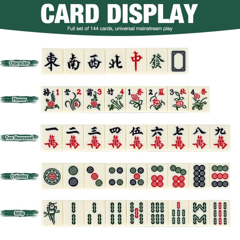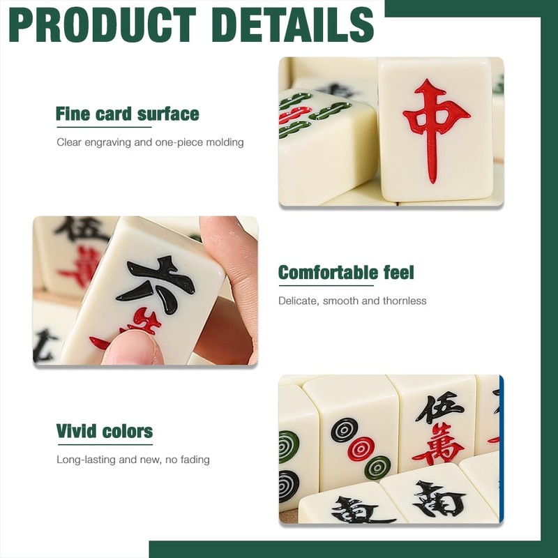 Durable: This chinese traditional mahjong set is made of melamine material, which is durable, wear-resistant and scratch-resistant. The melamine material has a smooth surface and a comfortable feel. The patterns and text on the mahjong tiles are clear and not easy to fade. Even after long-term use and multiple games, they can maintain a good appearance and quality, allowing you to enjoy the fun of the game.