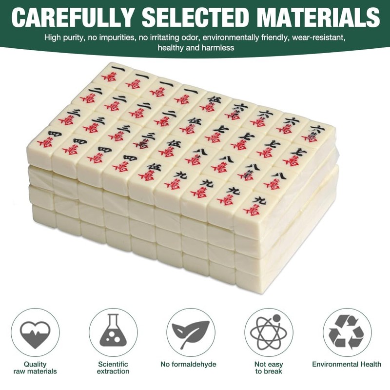 - High-quality material: This mini mahjong set is made of melamine material, which is not only durable but also has a smooth surface, so you can enjoy a comfortable feel when touching the mahjong tiles. In addition, the patterns and text on the mini mahjong set are clear and not easy to fade. Even after long-term use, they can remain as new, ensuring that the visual effects and experience of the game are not affected.