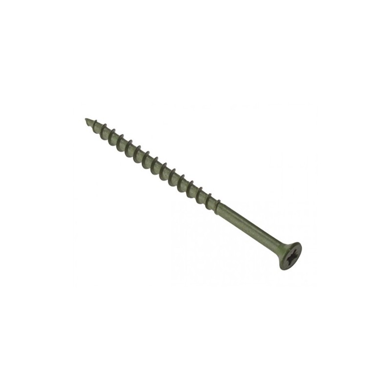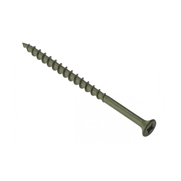 Product DescriptionA coarse single thread screw developed specifically for fixing decking. Head: Countersunk pozi compatible. Finish: Hardened and specialist Green Treated. Designed for decking but also ideal for other exterior timber and fencing uses. Pozidrive compatible head enables higher torque levels with a reduced risk of cam out. Extremely coarse thread provides increased holding power in all types of decking timber. Specifically designed to accommodate wood's natural tendency to expand and contract. Hardened and green treated for maximum durability in the face of the elements.Box Contains200 x Decking Screw
