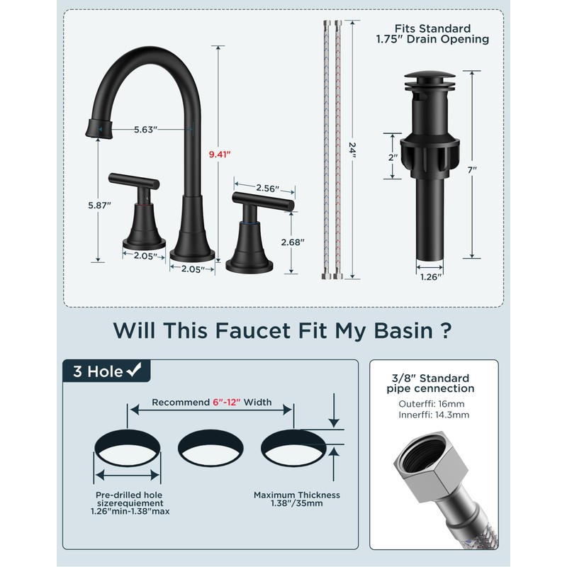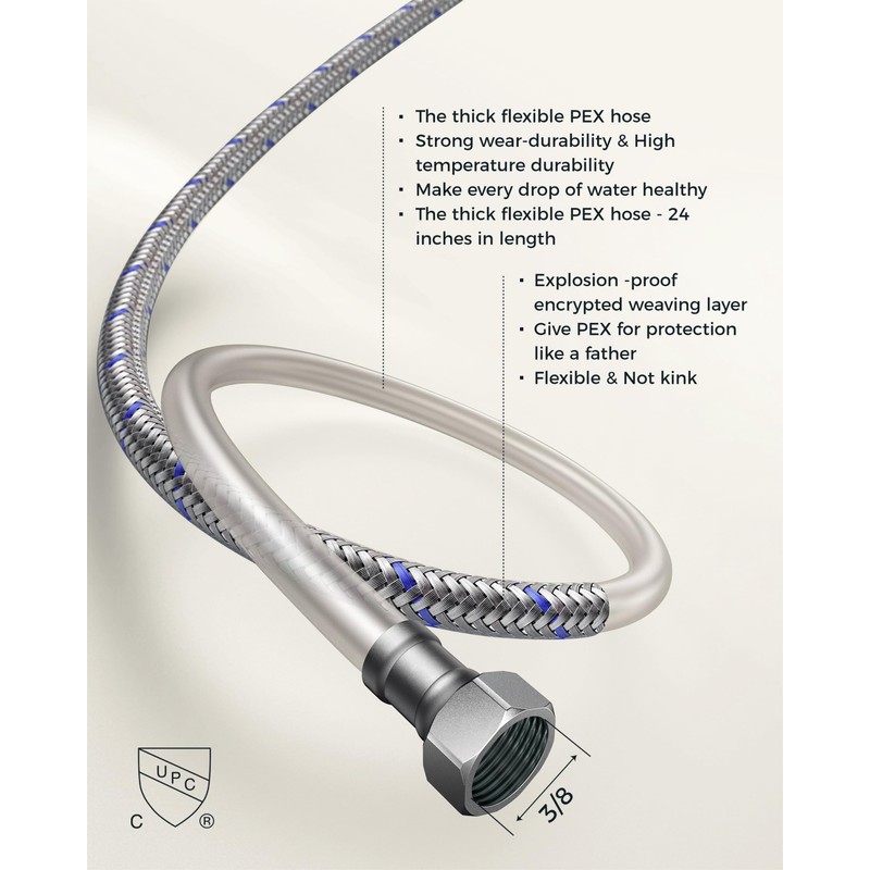 - CUPC HOSE: The 3 hole bathroom faucet integrated InnoFlex PEX supply line, wrapped in 24" braided Flexible hose, explosion-proof and high temperature. The US standard pipe connection 3/8 thread with built-in rubber ring effectively avoids leakage