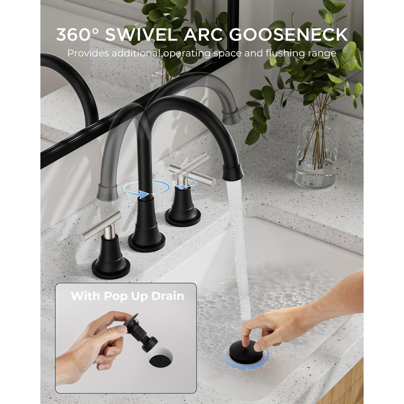 - USER-FRIENDLY: The 360-degree swivel high arc gooseneck matte black bathroom faucet provides an additional operating space and flush range. The extra spare 1.2 GPM Spare Aerator for your choice, saves 25% water without sacrificing performance. Flow rate: 1.2gpm/4.5L/min at Max 60psi