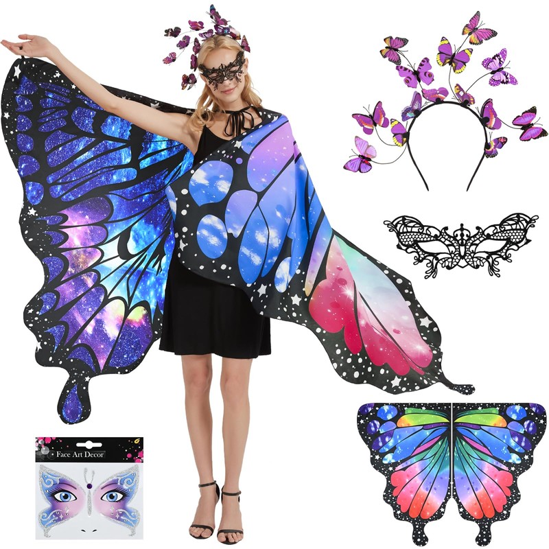 - Set of 4 butterfly costumes for women: a stunning and colourful butterfly costume set for women, consisting of a double-sided butterfly cape for adults x 1, a freely adjustable 5D butterfly hair band x 1, an enchanting lace mask x 1 and a unique eye sticker x 1 that bring your role to life at carnival and to life. The party will be the centre of .