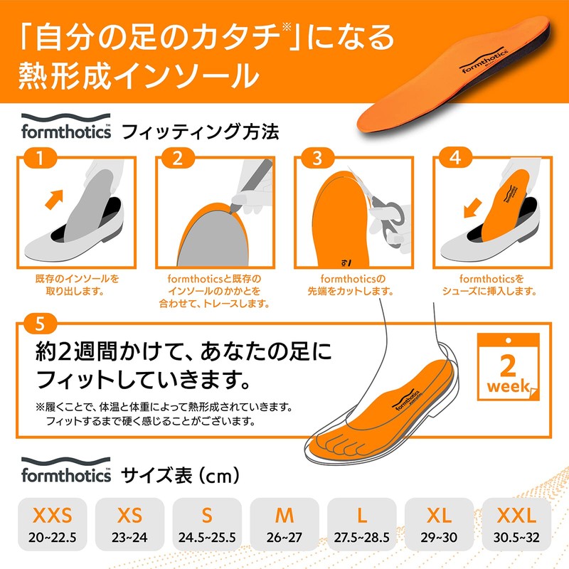 ■Orthopedic insole based on cutting-edge foot medicine that can be used for everyday shoes. ■ Foamsotics boasting overwhelmingly proven in New Zealand, which is the leading edge in foot medicine, is sold only by foot diseases. This is an authentic product for Japan. ■ Unlike ordinary insoles, this insole is designed to correct the legs and hips into a neutral position rather than protecting the legs from impacts. ■ Depending on the effect of the body temperature and weight, it can fit the shape of your foot precisely in about two weeks. This allows foam sotics to provide seamless support for the arch and heel for maximum effect. ■ By continuously using your favorite shoes, the natural and lower legs are corrected in a neutral position. ■ We have a variety of foam sotics according to the shape and size of the shoes. ■ Unlike injection moldings like other products, we have created a unique process that gently shaved from the lumps of raw material, which is the most important and extremely lightweight insole. ■ Anti-microbial treatment (Ultra-Fresh) prevents odor and prevents the growth of fungal and fungi. ■Recommended usage time 600km - 1000km or 1 year.