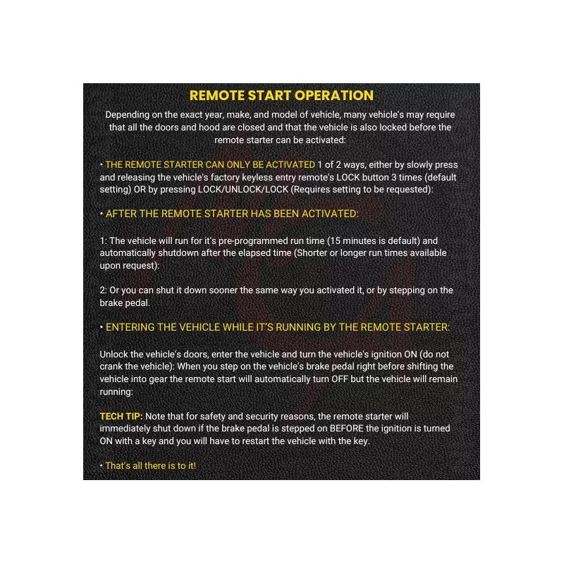 Pressing LOCK 3 times (w/Horn beep) on your OEM remote will activate the remote starter (default setting) OR, upon request, we can program it for you to activate by pressing the LOCK/UNLOCK/LOCK sequence (w/o Horn beep). Settings cannot be changed after installation.