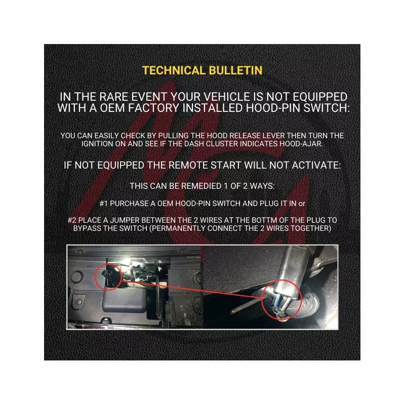 Vehicle MUST be equipped with an OEM factory installed HOOD-PIN SWITCH or the remote starter will not activate.