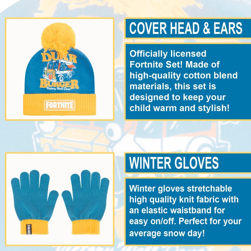 - DESIGN: Includes kids winter hat and glove set all featuring your favorite Fornite characters. Cool set of matching colors with a pom pom beanie