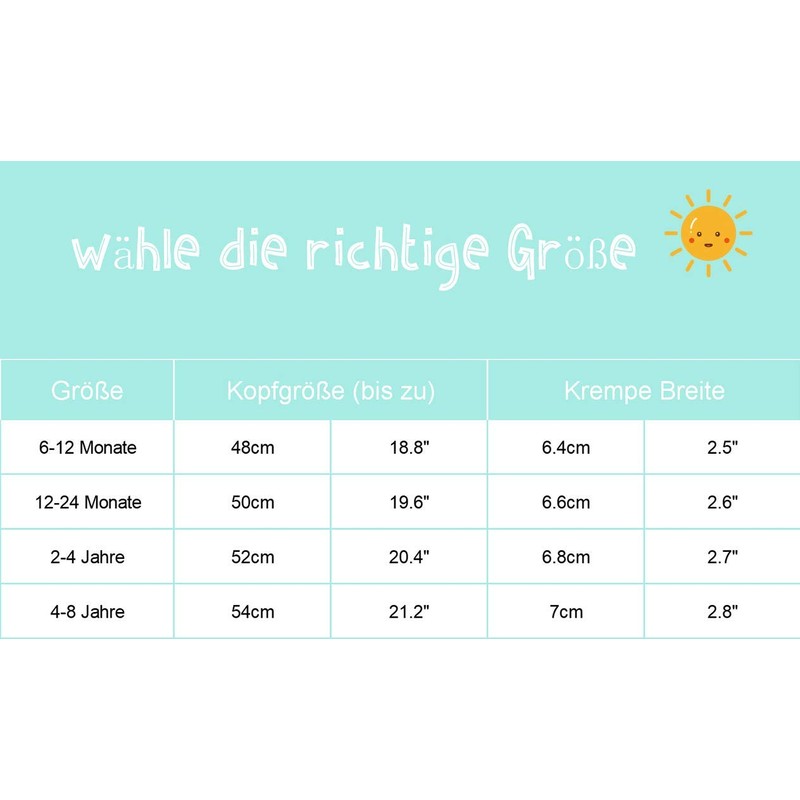 - Sizes: 48 cm, suitable for 6 - 12 months, 50 cm, suitable for 12 - 24 months, 52 cm, suitable for 2 - 4 years, 54 cm, suitable for 4 - 8 years of age.