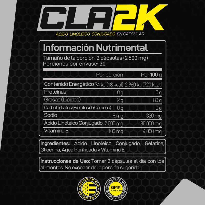 Cada frasco de CLA-2K proporciona 30 porciones, lo que equivale a un suministro mensual promedio si se consumen 2 cápsulas diarias con alimentos. Este producto es fabricado en una instalación registrada por la FDA en los Estados Unidos y cumple con las certificaciones GMP y NSF.