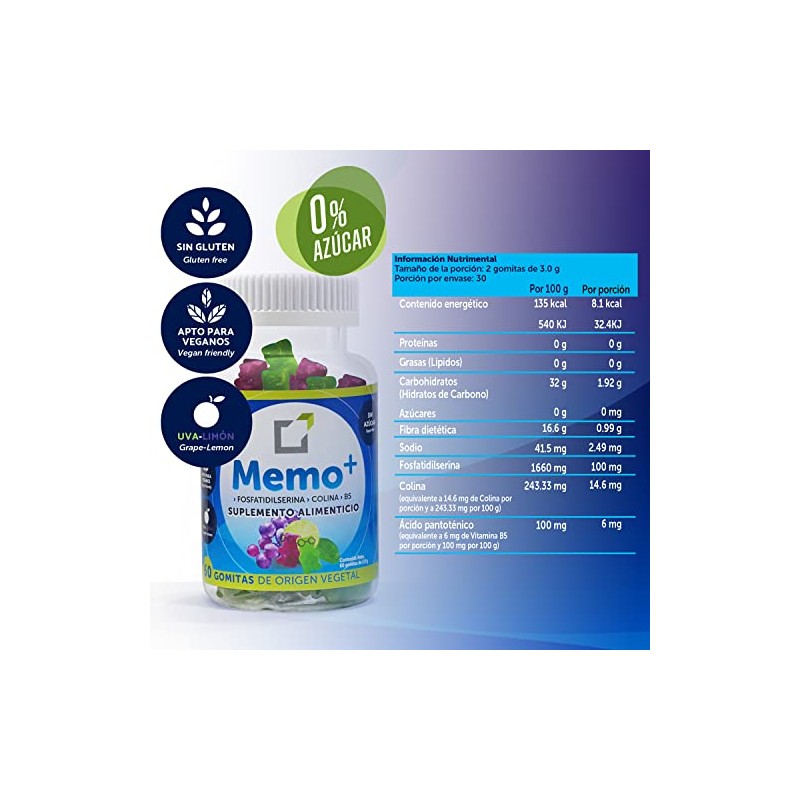 Fosfatidilserina 100 mg | 60 gomitas sin azúcar | Concentración, memoria| Combo 3 frascos