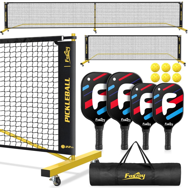 Fostoy Pickleball Net, Regulation Size 22 FT & Half Court 11 FT, Pickleball Set with 4 Fiberglass Paddles Outdoor Pickleballs and Carry Bag, Metal Frame for Backyards, Driveways, and Garages