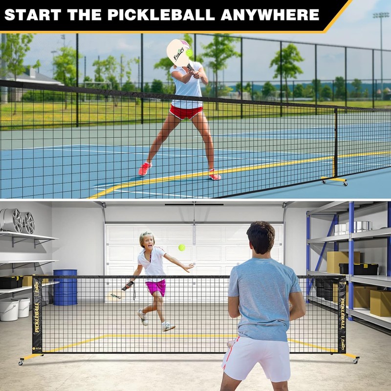 Pickleball Net with Wheels, Portable 2-in-1 Pickle Ball Net with Ball Collector,22FT Regulation Size & 11FT Half Court Size, Carry Bag, Steady Metal Frame for Outdoor Indoor Driveway (Yellow)