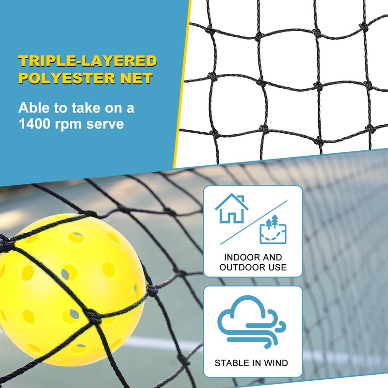 - {Sturdy Net} Looking for a portable pickleball net that can handle your power plays and fierce competition? Look no further than an 18-ply PE net has a 20-50% greater carrying capacity compared to other nets, and its sides are double-sewed onto the PVC tarp, making it more sturdy with zero tear resistance. It is designed to withstand long-term use without tearing, unlike other portable outdoor pickleball nets that have fewer layers, such as 15 or fewer.