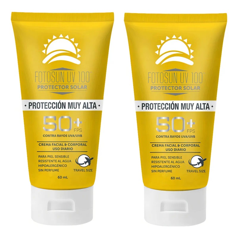 El protector solar Fotosun en formato doble es ideal para rostro y cuerpo, brindando una defensa eficaz contra los rayos solares. Su presentación portátil lo hace perfecto para llevar a cualquier lugar.