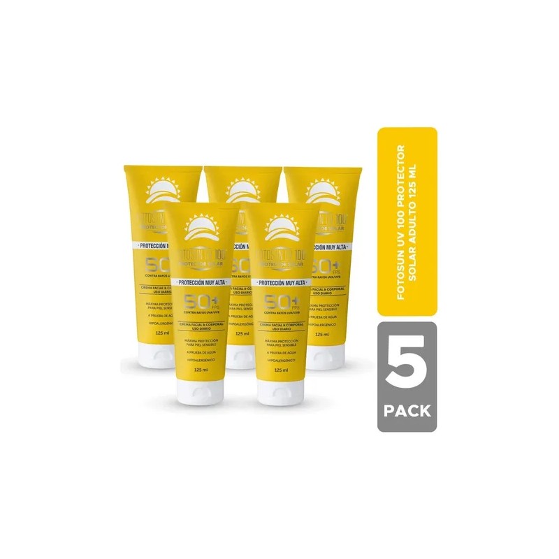 El pack Fotosun UV100 FPS 50+ ofrece 5 tubos de 125 ml de protector solar facial y corporal ideal para todo tipo de piel, con una textura no grasa y rápida absorción. Su fórmula vegana y hipoalergénica protege contra rayos UVA y UVB, evitando daños como envejecimiento prematuro y lesiones graves.