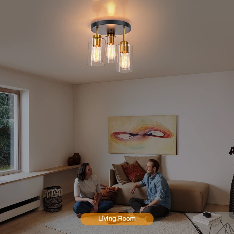 - 【Farmhouse & Industrial Design】foucasal black gold ceiling light fixture (L*W*H:11.8*9.4*11inch) featured a cylindrical shape. The farmhouse flush mount ceiling light used crafted and durable metal frame with black and gold metal finish to brings you a modern, antique and traditional feeling. 3 clear glass shades with high and low presentation design make it looks elegant and trendy. Providing a retro, artistic and charming look.Create a cozy, nature, love living environment.