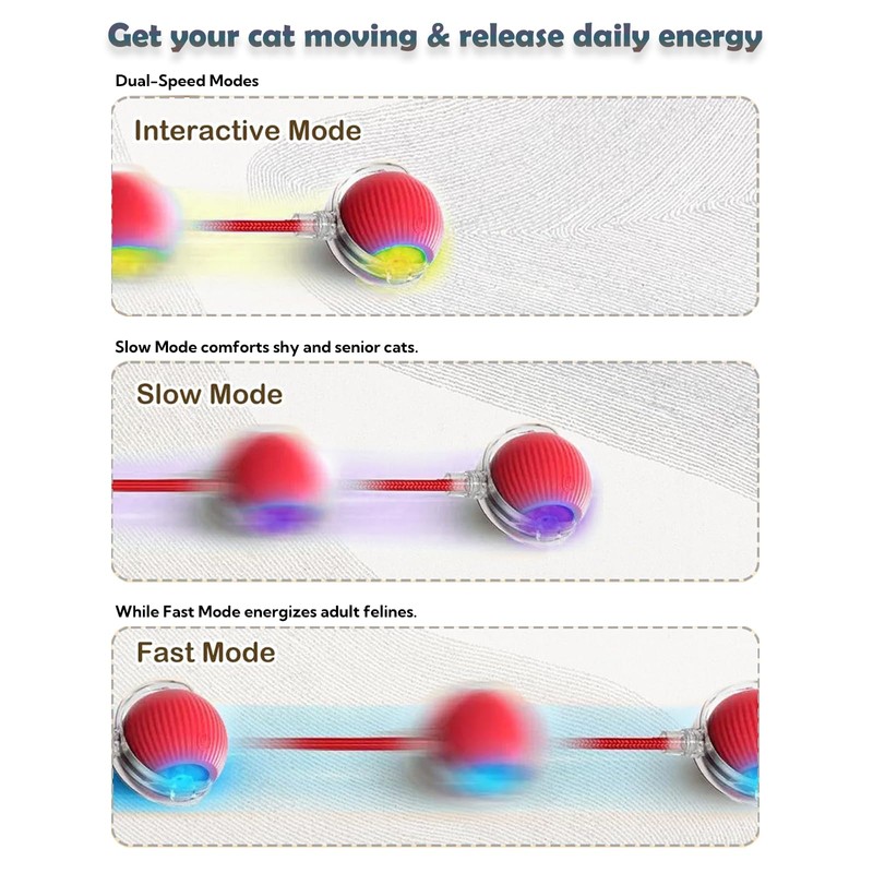 - 【Smart Interactive Modes & Auto-Dormant】Switch between 2 intelligent play modes: Active Chase (Blue Light): 5-minute continuous sprint for high-intensity play. Touch-Activated (Yellow Light): Auto-dormant after 5 minutes, restarting when your cat bats the ball—ideal for busy pet parents or multi-cat households. No more manual restarts