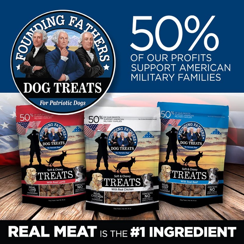 Founding Fathers Dog Treats contain real meat as the first ingredient. ​Our premium quality dog treats are available in 16 oz packages of Beef, Chicken or Lamb flavors. They are high in protein with no sugar added, no artificial colors or flavors and no artificial preservatives. They have a soft and chewy form that dogs crave. Founding Fathers Dog Treats are a healthy, nutritious and delicious treat for training, rewarding good behavior or any special moment!