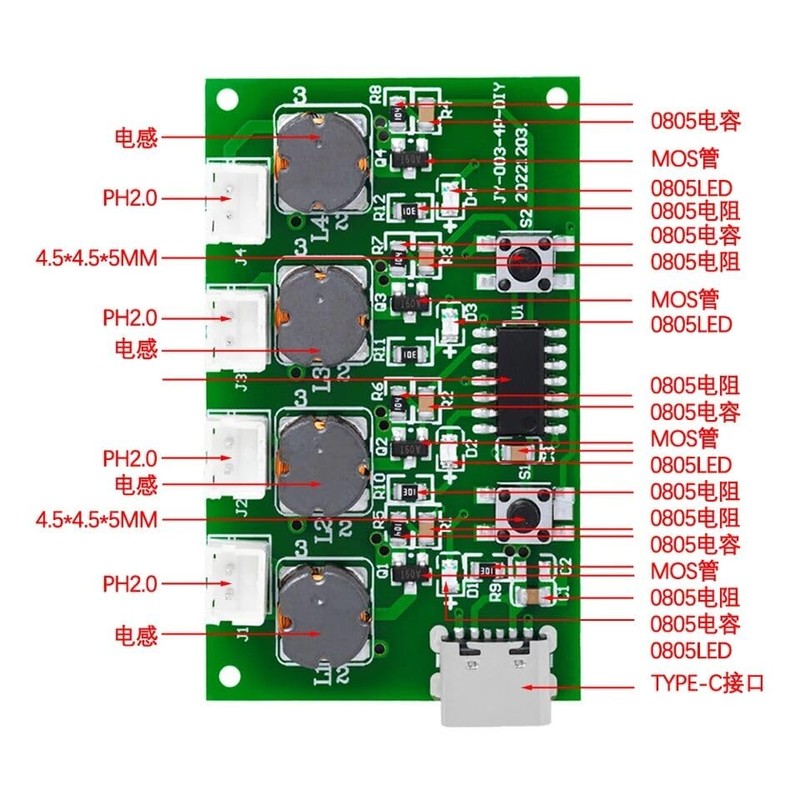 • Product name: four spray atomization driving board; Rated voltage: DC 5V; Atomization frequency: 108KHZ ± 2KHZ; Rated current: 300MA; Power: 2.5-3W