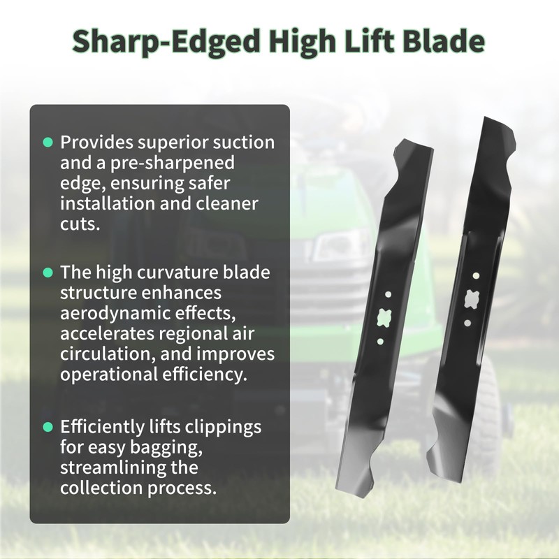 - [Durable Construction]: Constructed from robust metal and finished with a black coating, this High-Lift blade is engineered for durability. Its specially designed edges enhance performance, making it effective for bagging or propelling grass clippings over a distance, especially in thick grass areas. Caution: May not perform optimally in sandy or loose soil conditions.