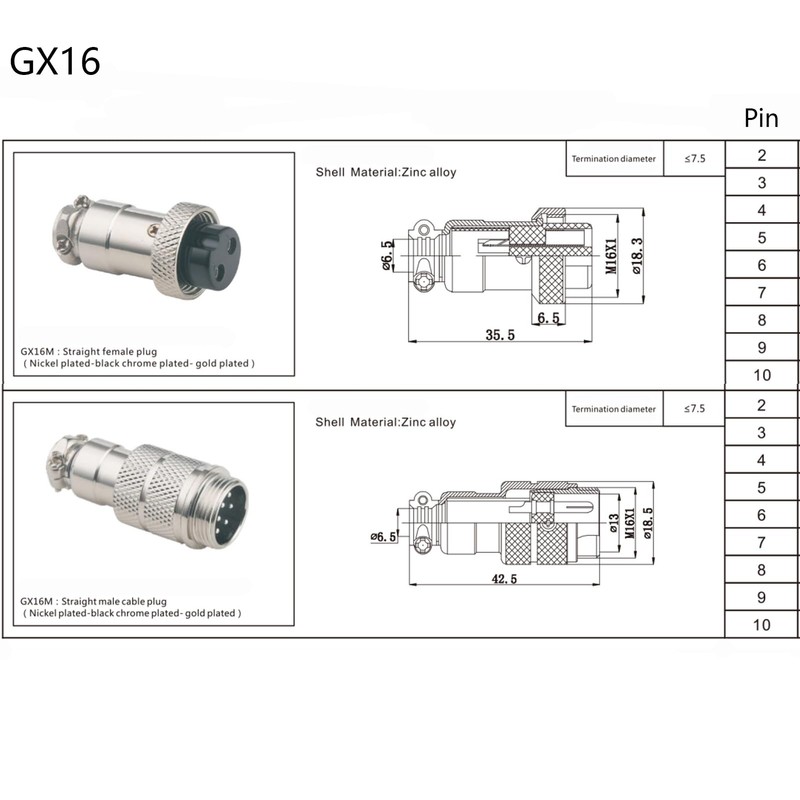 - [Thread Aviation Plug Female GX16 5 Pin]: Metal and hard plastic; Shell material: Zinc Alloy; Connector pins material: fine copper silver plating; The aviation connector is used widely