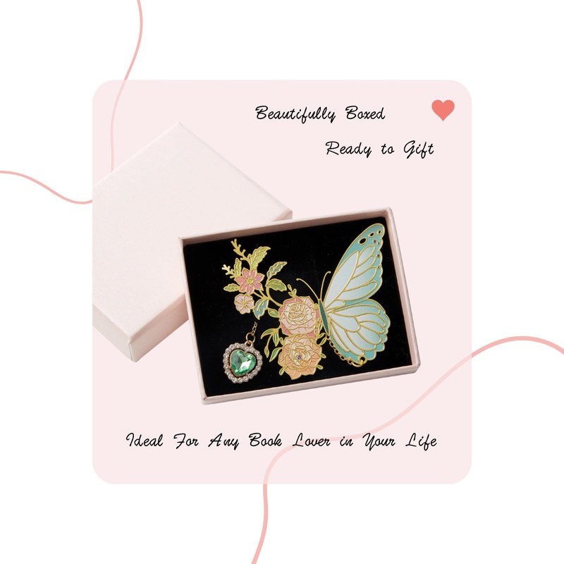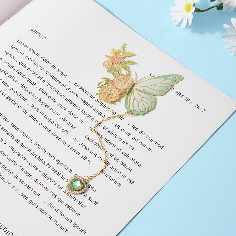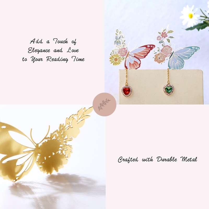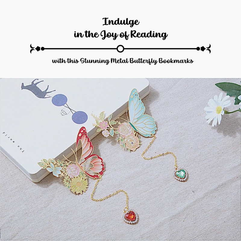 - Enchanting Imagery: Two gold-plated bookmarks, each featuring a unique butterfly poised atop a bouquet of flowers, rendered in delicate enamel for a touch of whimsy.