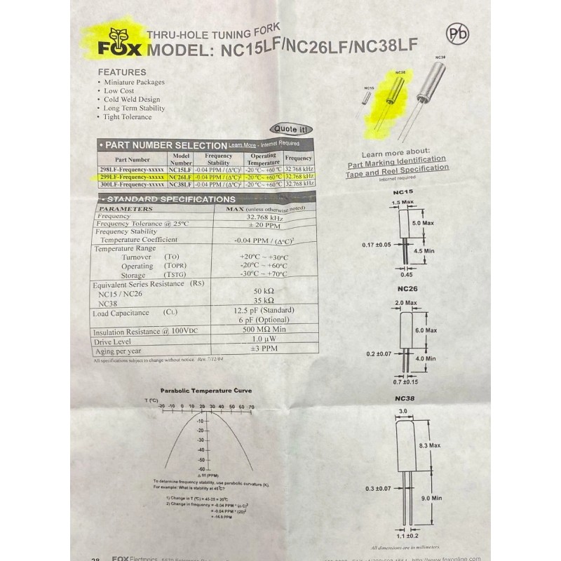 FOX NC26-32.768KHz Crystal Tuning Fork 12.5pF 20PPM 2mm X 6mm **NEW** Qty.10