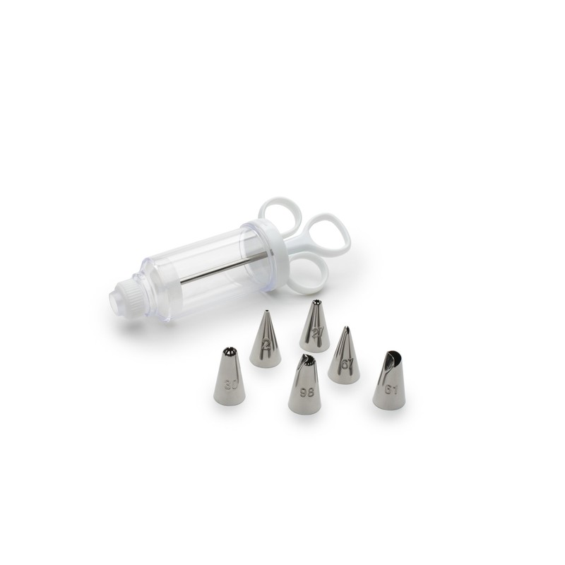 - 7 piece set includes 1 icing syringe and 6 metal tips