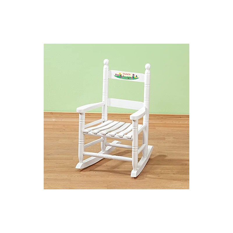 Young nature lovers will enjoy reading, watching TV or hanging out with Mom and Dad in their very own Personalized Flowers & Butterflies Children's Rocking Chair--rocking along with bright butterflies and blooming flowers! Just the right size for children, our solid wood rocking chair blends the best of quality craftsmanship with a fun, personalized touch kids love. The heirloom-style children's furniture design features a comfy slatted seat, ladder back, rounded arm corners and rounded finials. Its durable plastic name plaque features exclusive flowers & butterflies artwork, and the sweet garden scene can be personalized for one special child! A custom gift for a baby shower, birthday, Christmas, preschool graduation or any occasion, our personalized rocking chair is available in 3 painted colors or a natural wood finish. Specify name; limit 1 line, 12 letters/spaces. 14 1/2" wide x 11 1/2" deep; 22 1/2" overall height. Name plaque is 6" wide x 1 1/2" high. Seat is approximately 9" from floor; holds up to 70 pounds. Instructions and hardware included for assembly of the butterfly rocking chair. Please note: At this time, we are only able to personalize characters from the English keyboard.