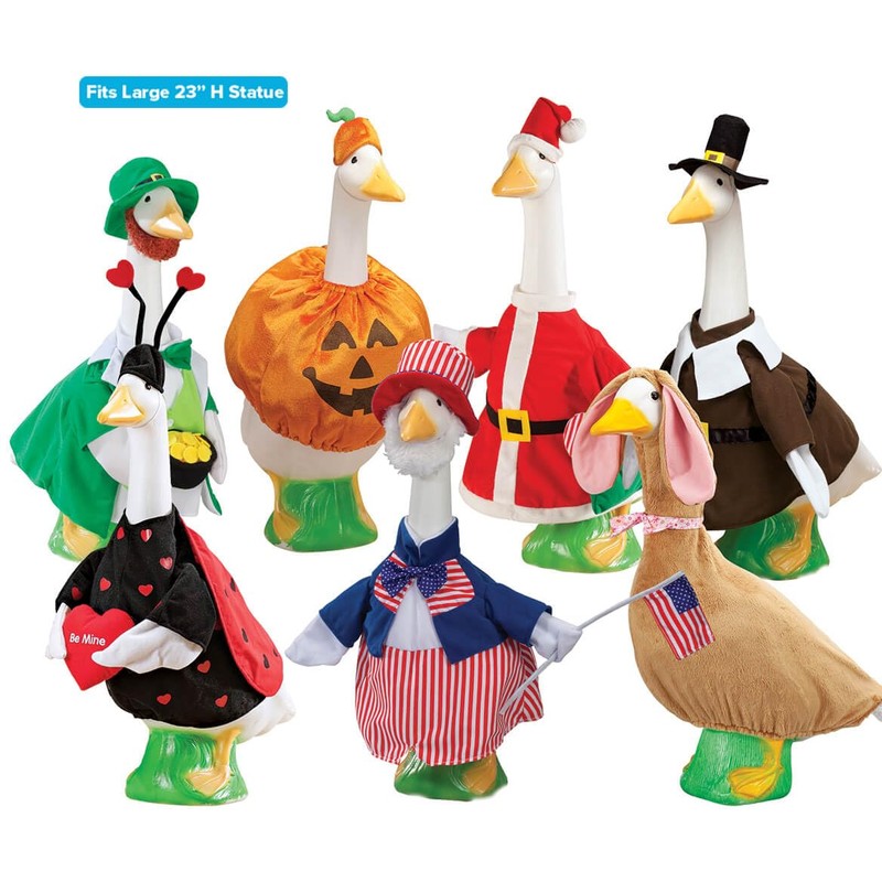 • Set includes 7 outfits: Conversation Heart, Leprechaun, Brown Bunny, Statue of Liberty, Candy Corn, Pilgrim and Santa Goose