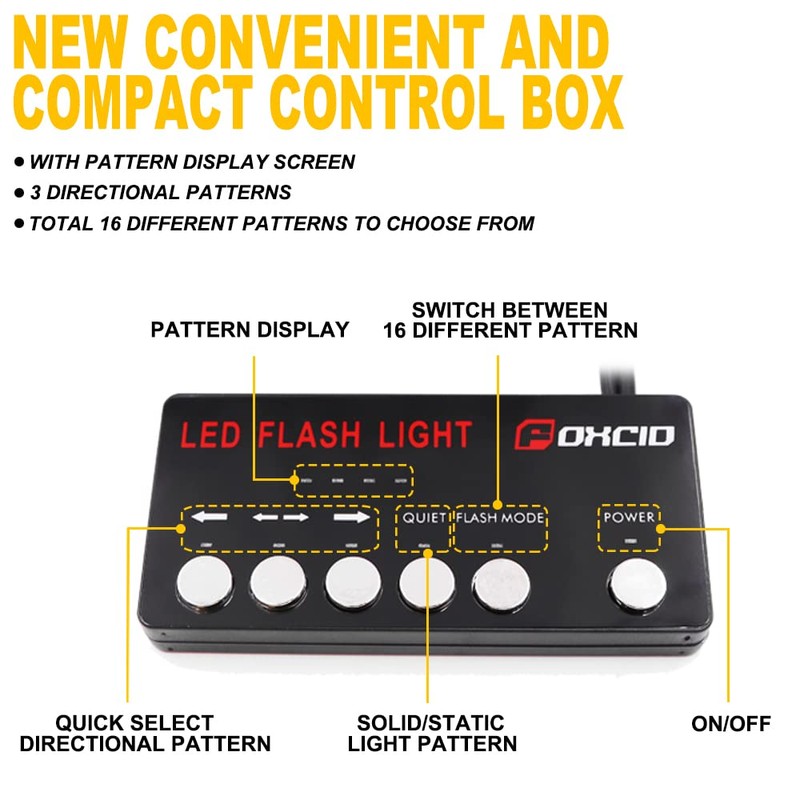 - 【DISPLAY CONTROL BOX】 Users can use the compact control box easly swtich to different flashing pattern. You can also see the flashing patterm on the control box, it makes easier help users adjust the flashing pattern