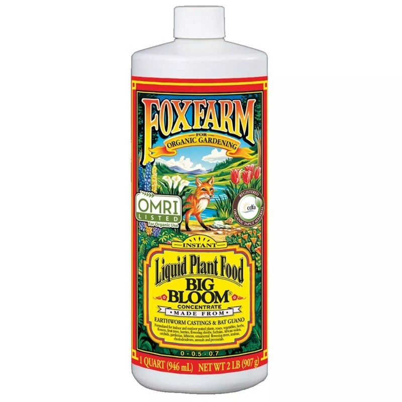 Big Bloom® is a Natural & Organic Blossom Builder. Our special, micro-brewed formula incorporates earthworm castings, bat guano and other high test organic ingredients that offer a full range of nutrients. Norwegian kelp improves nutrient uptake and increases yields. Rock phosphate helps transfer energy from one part of the plant to another, which means bigger buds and more fragrant flowers.Tiger Bloom® is our most Vicious Bloomer with Micronutrients. FoxFarm Tiger Bloom® is an ultra potent, fast acting, high phosphorus fertilizer that also contains a good supply of nitrogen for growth and vigor. It is formulated with a low pH to maintain stability in storage and keep micronutrients available. Tiger Bloom® can be used for both hydroponic and soil applications. When used as directed Tiger Bloom® encourages abundant fruit, flower, and multiple bud development.Grow Big® delivers Extra Strength Grow Power with Micronutrients. Get your garden going with Grow Big®, our fast-acting, water-soluble fertilizer for lush, vegetative, compact growth. Use Grow Big® early in the season when young plants need an extra boost. We add earthworm castings and Norwegian kelp into this special brew to encourage sturdier, healthier stems and leaves, but we also provide enough nutrients and trace minerals to create the kind of healthy branching that you'll need later in the season for more abundant buds and blooms.