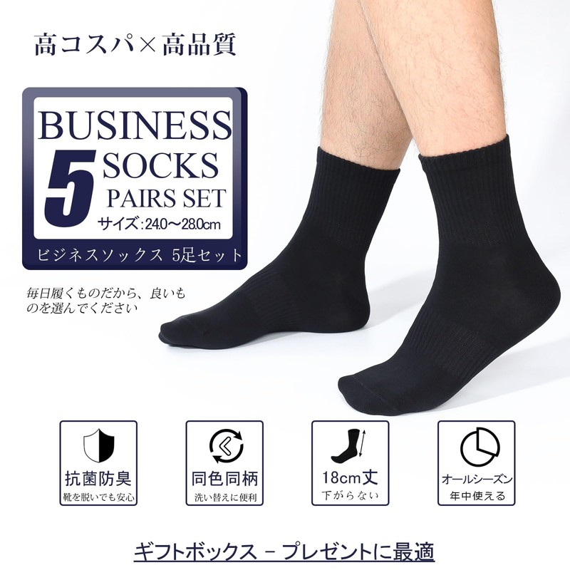 FOXHOME Men's Socks, Black Business Socks, No Stuffy, Tear-Resistant, Odor, Antibacterial, Deodorizing, Anti-pilling, Breathable, Combed Cotton, Men's Socks, Set of 5, 9.4 - 11.0 inches (24.0 - 28.0